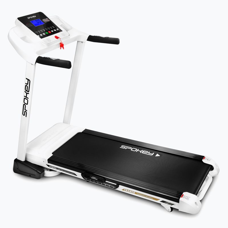 Компактна електрическа пътека Spokey Trance с модерен амортизационен и хидравличен сгъваем механизъм. Максималната скорост е 16 км/ч, а товароносимостта 110 кг.