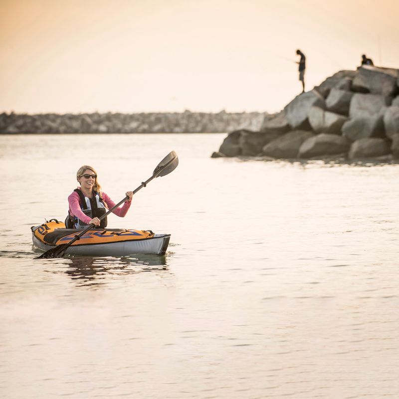 Надуваемият едноместен каяк AdvancedFrame Sport на Advanced Elements е олекотена версия на класическия каяк AdvancedFrame, отличаващ се с голям отвор в кокпита за лесно влизане и излизане. Моделът Ton е иновативна комбинация от характеристиките на твърдите каяци и компактността на надуваемите лодки. Спортният каяк AdvancedFrame се отличава със специално разработена конструкция на корпуса, при която алуминиеви ребра прецизно определят носа и кърмата, което значително улеснява управлението. Освен това носът и кърмата са подсилени с допълнителни шевове . Цялата конструкция е свързана със заварени шевове и е покрита с плат RipStop. Трислойният материал, от който е изработен каякът, е изключително устойчив на повреди, което гарантира дълготрайността на оборудването. Това означава, че ще можете да се наслаждавате на каяка си в продължение на много години.Друго предимство на модела AdvancedFrame Sport са функционалните екстри, които повишават комфорта му. Усъвършенстваните функции, като вградения в пода предпазен клапан и пружинния клапан, предлагат не само комфорт, но и безопасност при плуване. Каякът разполага и с оформени гумени дръжки, D-образен пръстен за закрепване, отделение за съхранение и Skeg плавник за проследяване.Основни характеристики