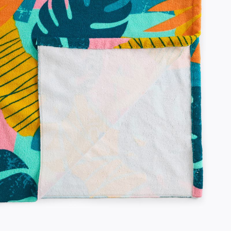 Пончото привлича вниманието с цветен, летен принт с листа и цветя в наситени цветове. Мотивът внася положителна енергия и идеално се вписва в атмосферата на лятото, плажа и безгрижната забава. Децата с удоволствие го носят, а родителите оценяват неговата видимост – лесно е да се забележи малкото дете отдалеч.