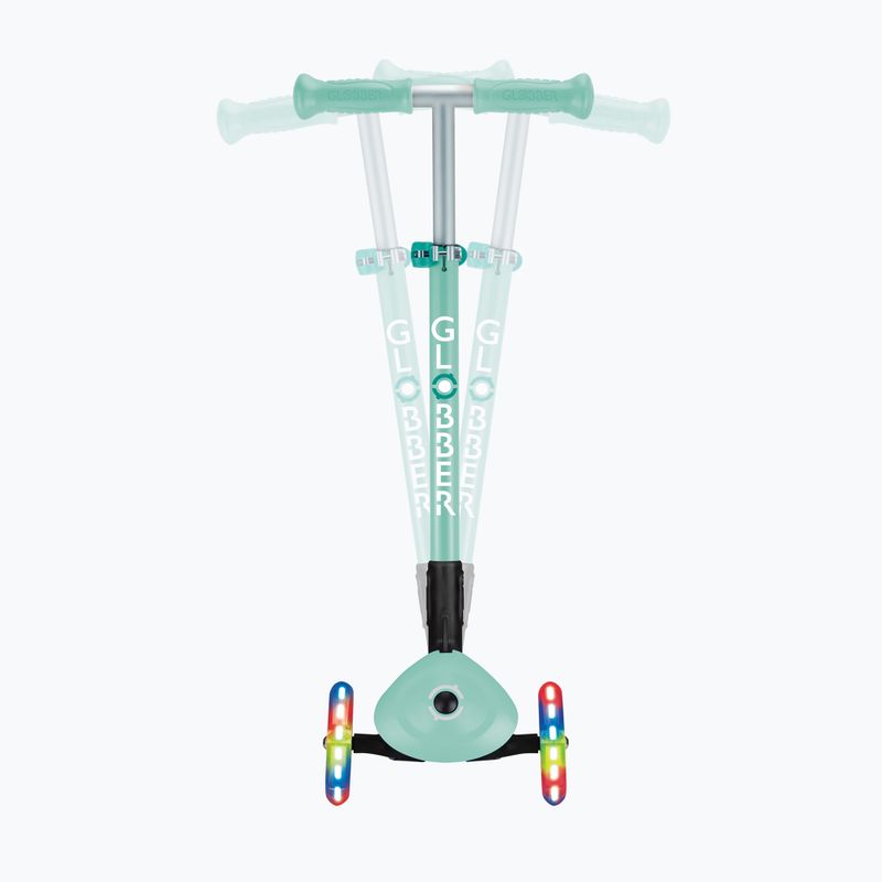Globber Primo Foldable Lights mint се отличава с възможност за регулиране на височината на кормилото в три нива: 67,5 см, 72,5 см и 77,5 см, което позволява адаптиране към ръста на потребителя в диапазона от 95 до 120 см. Екологичната насоченост е постигната чрез използване на материали от рециклиране, което прави този продукт по-екологичен. Тротинетката е подходяща за деца с максимално тегло до 50 кг.