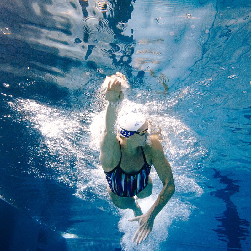 Гърбът му е уникално изрязан, за да осигури свободно движение на раменете при плуване във всеки стил.