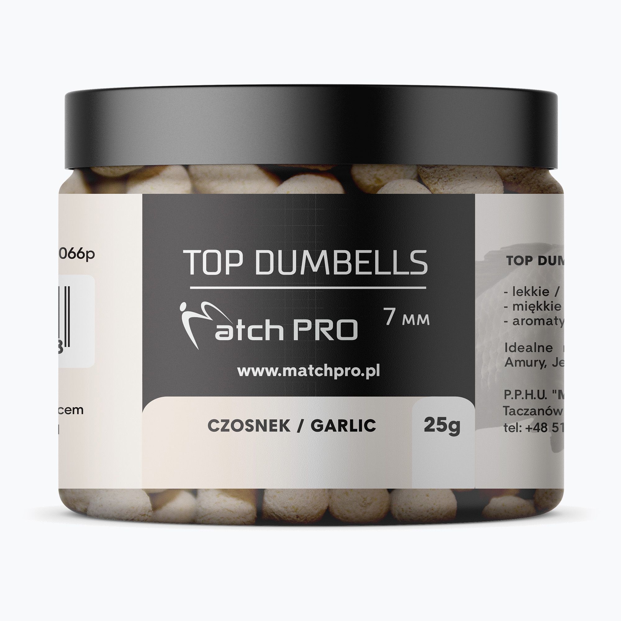 Серия висококачествени примамки с форма на валяк (dumbells) с размер 7 мм. Дълги и интензивни тестове на тези примамки позволиха да се усъвършенства техният състав и свойства, така че да бъдат много ефективни при всякакви условия. Това, което отличава Matchpro top dumbells, е идеалната мекота, благодарение на която рибите ги взимат уверено. Изключителната лекота на примамката осигурява много естествено поведение във водата, което значително повишава ефективността на риболова. Top Matchpro Dumbells са много ароматни, отделяйки дълго време равномерно аромат във водата, което се отразява в голям брой кълванета.