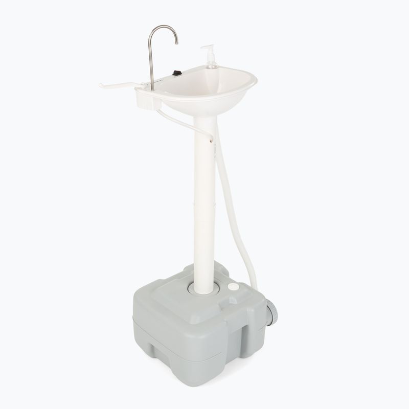 Преносимата мивка разполага с бутон за управление, който стартира водната помпа бързо и интуитивно. Механизмът осигурява стабилна производителност на потока при всяко използване на хигиенното място. Филтриращата система на входа на водата ограничава проникването на дребни замърсявания в помпата.